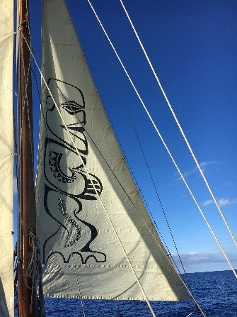 The Headsail is Kau’ukura an ancient ancestor of the Polynesian race who who came with a fleet of canoes from western Polynesia, some 300 years before Tangiia and Karika and colonised many of the islands east of Samoa and also set up the sacred Marae Taputapuatea on Rai’atea, most high chiefs of Polynesia trace their lineage back to this ariki, he was also the grandson of the ariki who built the original vaka Takitumu.